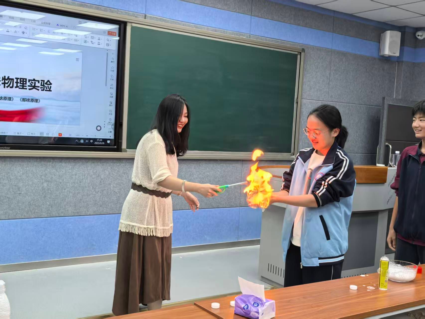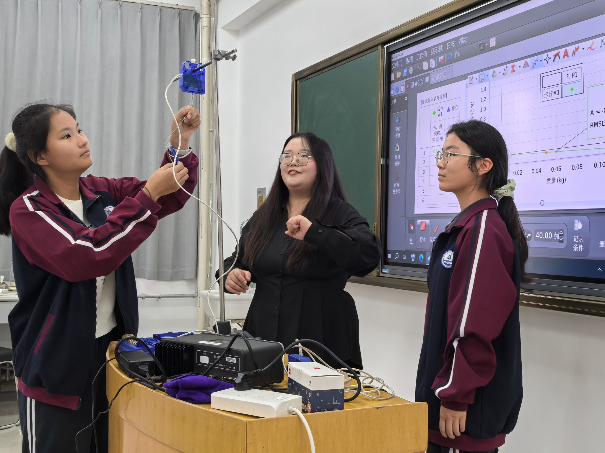 本次科普活动采用分组轮换体验模式。在星火科普馆,刘平安教授以幽默诙谐的方式向同学们展示各种神奇有趣的物理现象,学生们积极参与了牛顿摆、磁悬浮、共振、梦幻时钟等多项实验,亲身体验到物理的奇妙之处;在趣味物理实验室,康缈教授和研究生指导学生亲身体验“浮力”“火焰掌”等震撼而有趣的实验现象,将抽象的物理概念转化为直观的互动体验;在数字化实验室,魏凌教授和两名研究生借助PASCO数字化实验设备,对“重力”“机械波”等物理规律展开定量探究,展示了PASCO实验装置在初中物理教学与学习中的应用。