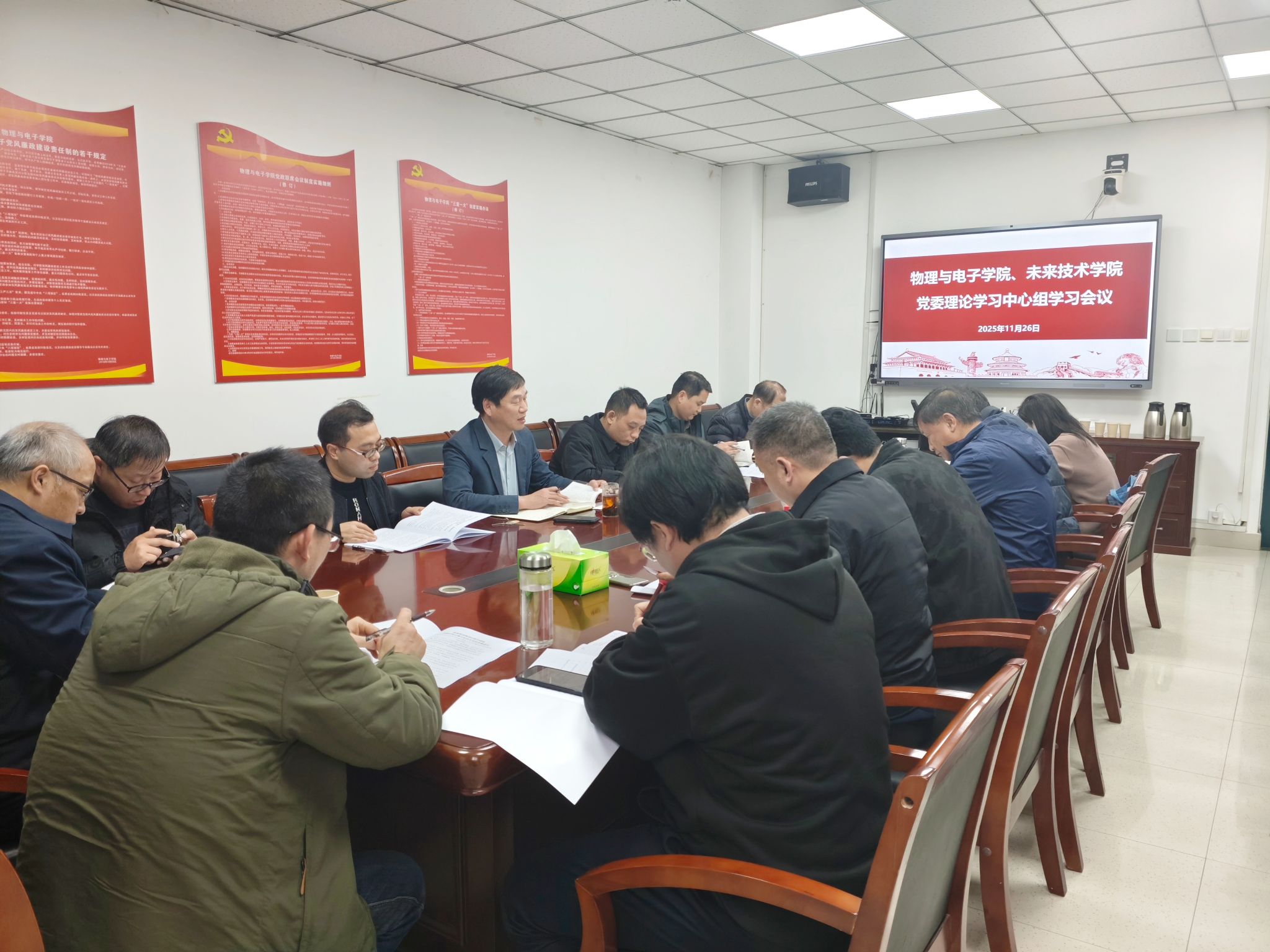 、未来技术学院(量子信息)党委理论学习中心组在A311会议室召开本年度第12次集体学习会议。两个学院的党委委员、领导班子成员、组织员及党员代表参加学习。会议由学院党委书记张慧主持。