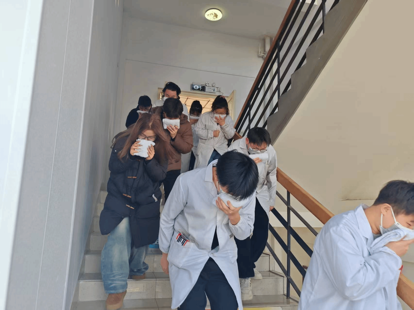 火灾事故疏散演练环节,各实验室师生迅速响应,在杨毅老师指挥下,按照预定疏散路线,弯腰、捂口鼻,有序撤离至学院楼前安全集结区,整个过程紧张有序,仅用时3分15秒。
