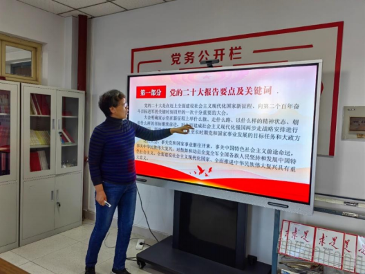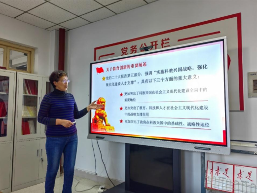 在党课讲授中,王宏华首先与支部党员一起学习领会了党的二十大报告中的主要内容,紧扣党的二十大报告中15个部分重点内容进行讲解,阐述了党的二十大召开的重要意义,并对党的二十大报告中着重强调的“中心任务”“中国式现代化”“两步走”“第一要务”“重大原则”“着力点”“国家创新体系整体效能”“全过程人民民主”等16个关键词进行了深入细致的宣讲。随后,王宏华对党的二十大报告中关于教育创新的表述进行了梳理分析:党的二十大报告将教育、科技、人才“三位一体”统筹安排、一体部署,明确了科教兴国战略的科学内涵和使命任务。她强调,党的二十大报告是党和国家未来一段时期的施政纲领,科教兴国战略更加突出了教育、科技和人才在社会主义现代化建设中的战略支撑作用。她结合学校学院发展实际,通过介绍麻豆在线