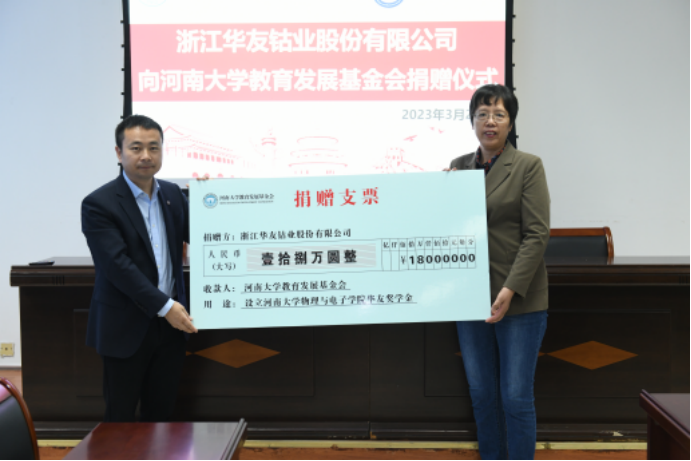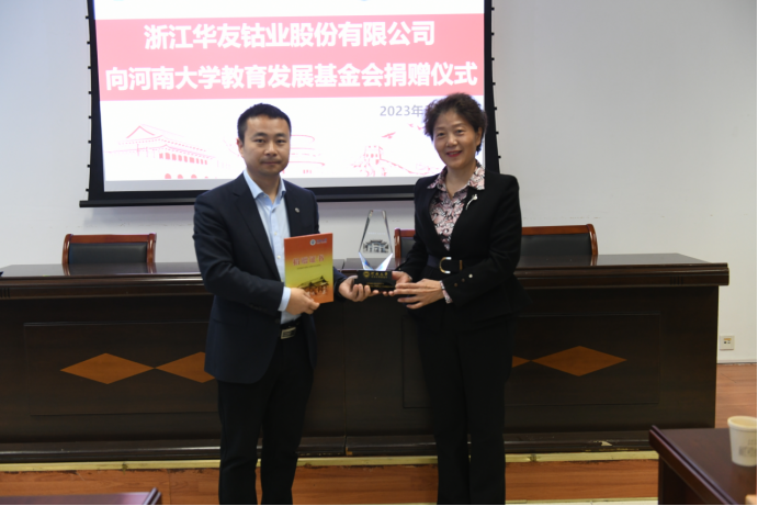教育发展基金会秘书长刘波向捐赠方浙江华友钴业股份有限公司颁发捐赠证书和奖学金水晶杯。