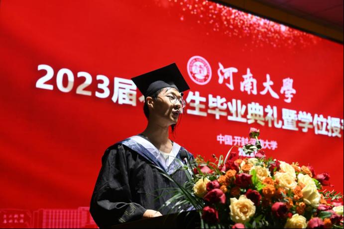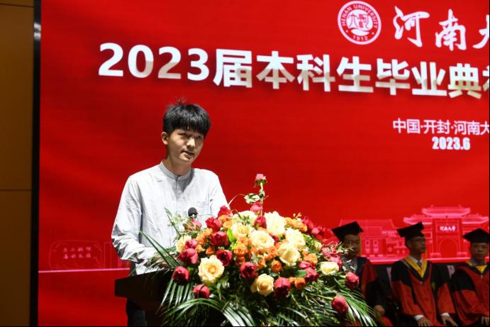 追风赶月莫停留,平芜尽处是春山。2023届本科毕业生代表于宏博由衷的感谢学院四年来的悉心培养,对一直以来为辛苦付出的老师们致以最崇高的敬意!并表示2023届毕业生一定不忘初心,继续勇往直前去追求平凡中的卓越,扬起胜利的风帆去创造平静中的升华,用自身无限魅力去实践青春无悔的诺言。