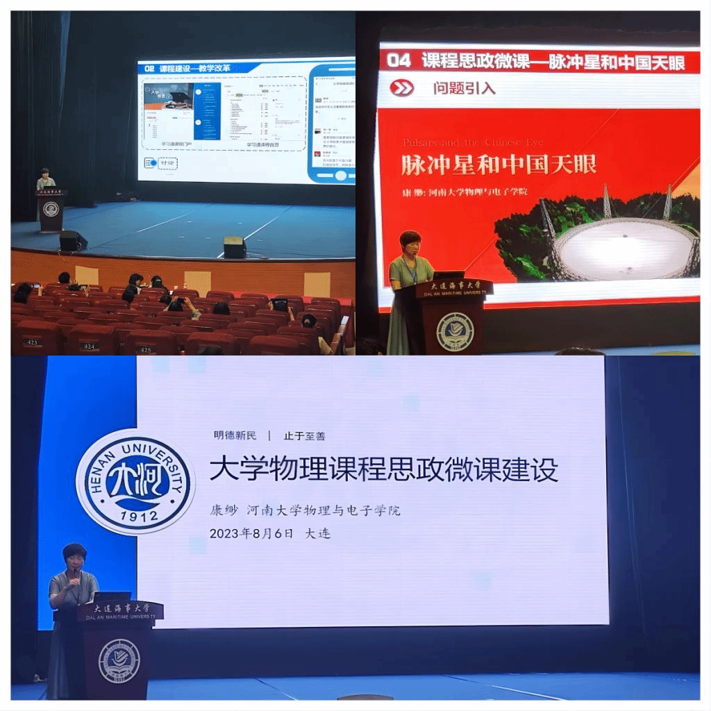 2023年8月5-8日,由教育部高等学校大学物理课程教学指导委员会课程思政工作委员会主办、大连海事大学承办的大学物理及大学物理实验课程思政研讨班在辽宁省大连市召开。来自清华大学、南京大学、西安交通大学、中国科技大学、中国矿业大学等近200名专家学者参加此次会议。麻豆在线大学物理教研室教师康缈、任凤竹和李若平应邀参加了此次会议,康缈在会上作了题为《大学物理课程思政微课建设》的主题报告。